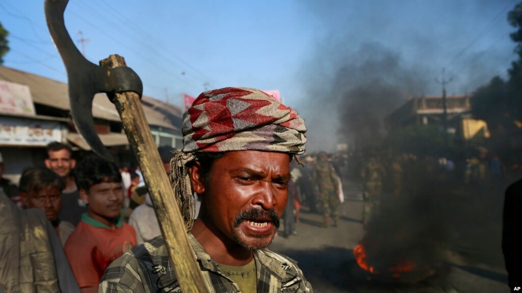 Seorang penduduk adat melakukan protes atas serangan yang dilakukan oleh kelompok etnis separatis di Desa Shamukjuli, Assam, India (24/12/ 2014). Para demonstran berkumpul hari Jumat di Guwahati, kota utama di negara bagian Assam, sembari membawa spanduk-spanduk yang mencela kelompok penduduk asli separatis yang dicurigai melakukan serangan-serangan tersebut.